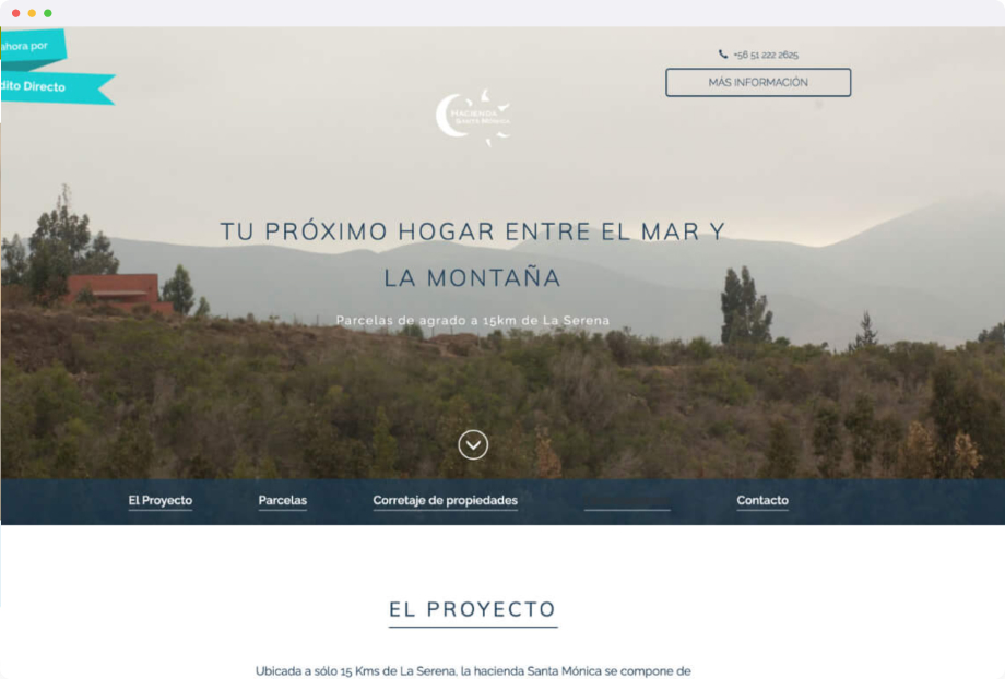 La Hacienda Santa Mónica es un proyecto inmobiliario en el norte de Chile de loteo de parcelas privadas. El cliente buscaba una página que le permitiera mostrar el proyecto y permitirle a los interesados pedir más información sobre los lotes disponibles